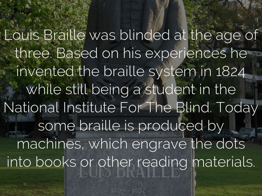Louis Braille was blinded at the age of three. Based on his experiences he invented the braille system in 1824 while still being a student in the National Institute For The Blind. Today some braille is produced by machines, which engrave the dots into books or other reading materials.
