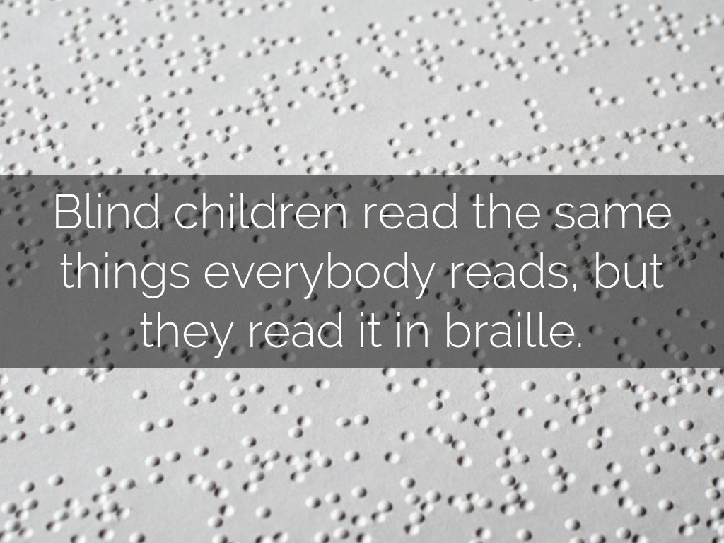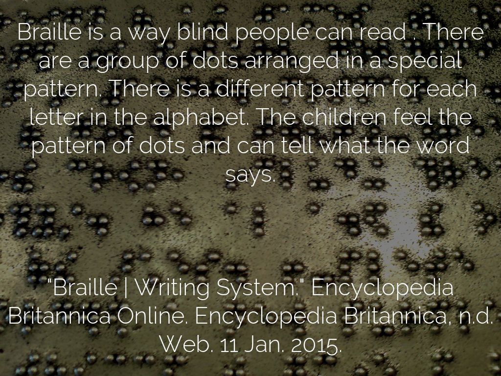 Braille is a way blind people can read . There are a group of dots arranged in a special pattern. There is a different pattern for each letter in the alphabet. The children feel the pattern of dots and can tell what the word says.