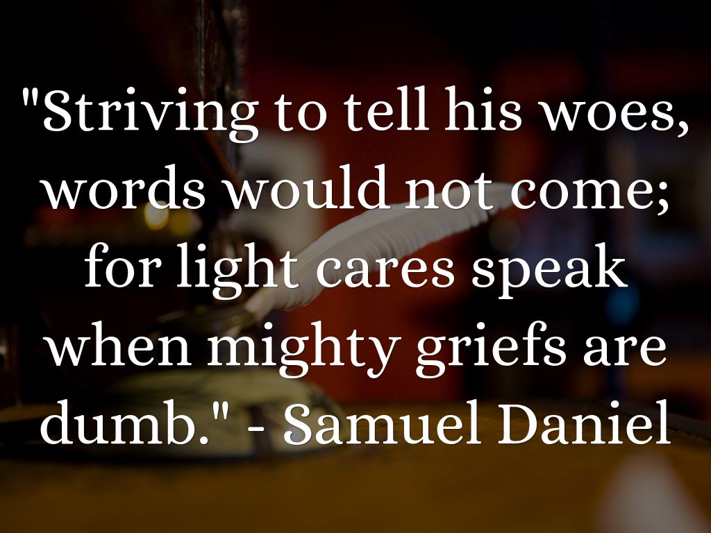 "Striving to tell his woes, words would not come; for light cares speak when mighty griefs are dumb." - Samuel Daniel