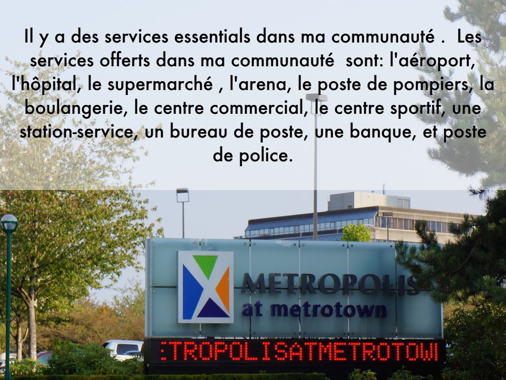 Il y a des services essentials dans ma communauté . Les services offerts dans ma communauté sont: l'aéroport, l'hôpital, le supermarché , l'arena, le poste de pompiers, la boulangerie, le centre commercial, le centre sportif, une station-service, un bureau de poste, une banque, et poste de police.