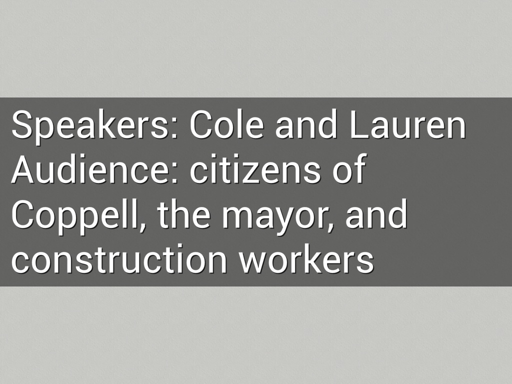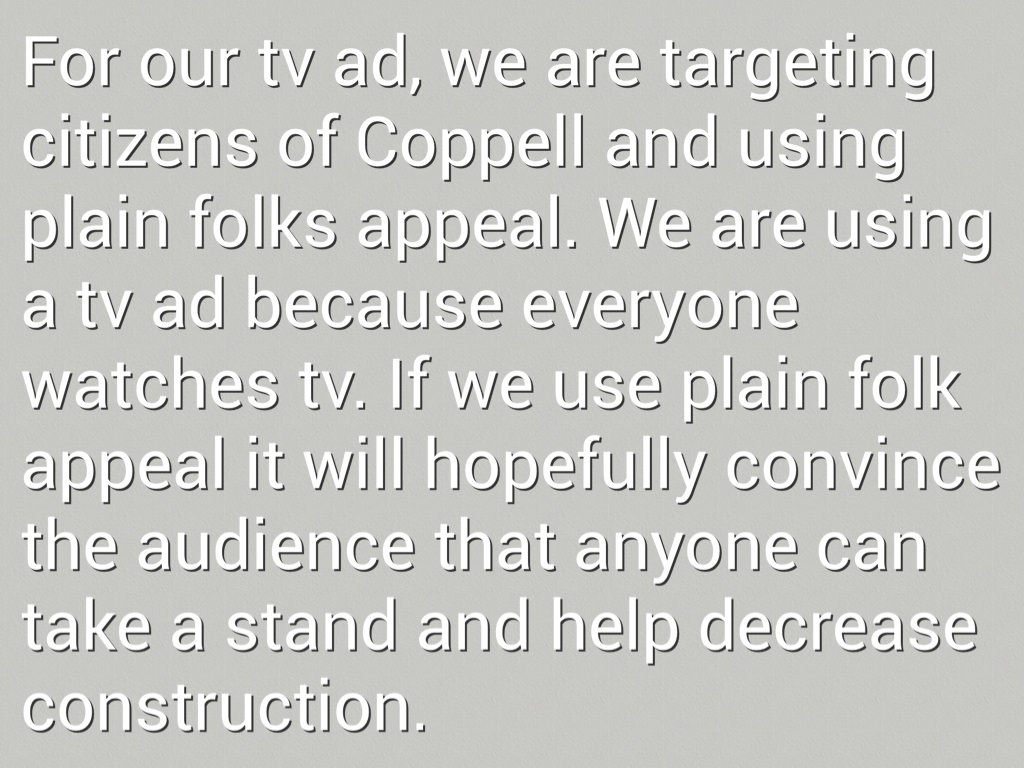 For our tv ad, we are targeting citizens of Coppell and using plain folks appeal. We are using a tv ad because everyone watches tv. If we use plain folk appeal it will hopefully convince the audience that anyone can take a stand and help decrease construction.