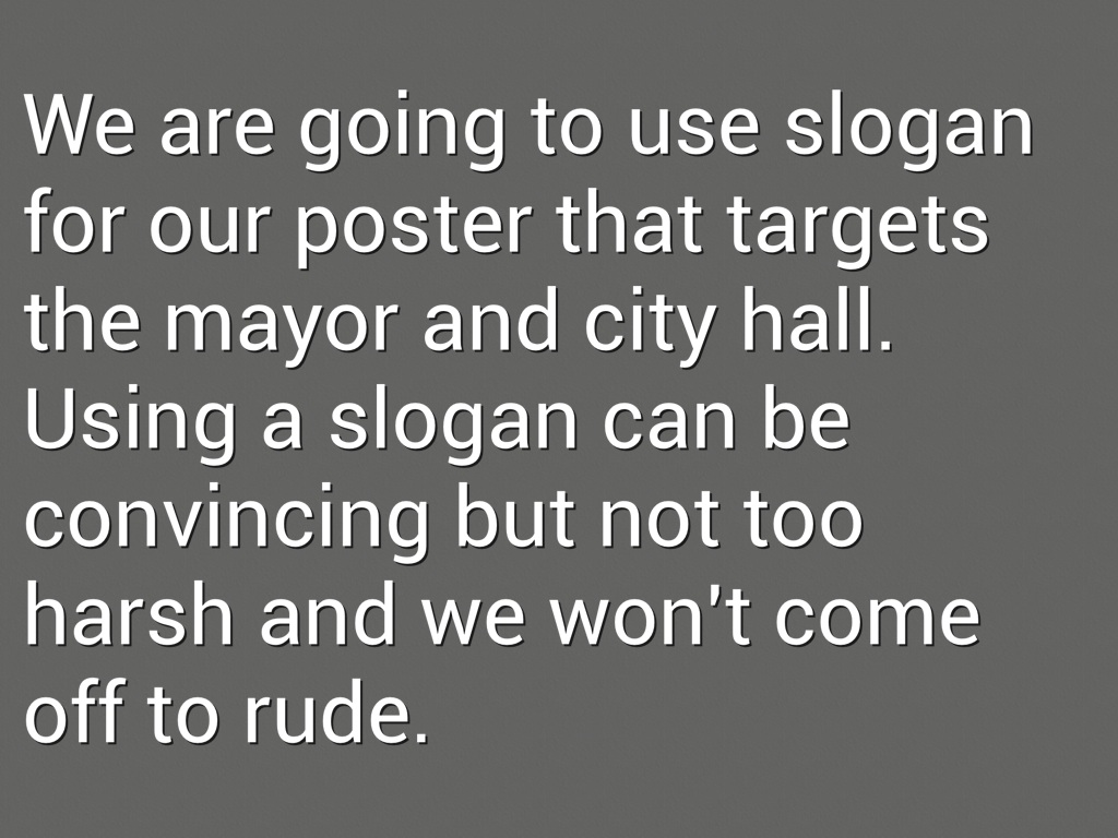 We are going to use slogan for our poster that targets the mayor and city hall. Using a slogan can be convincing but not too harsh and we won't come off to rude.