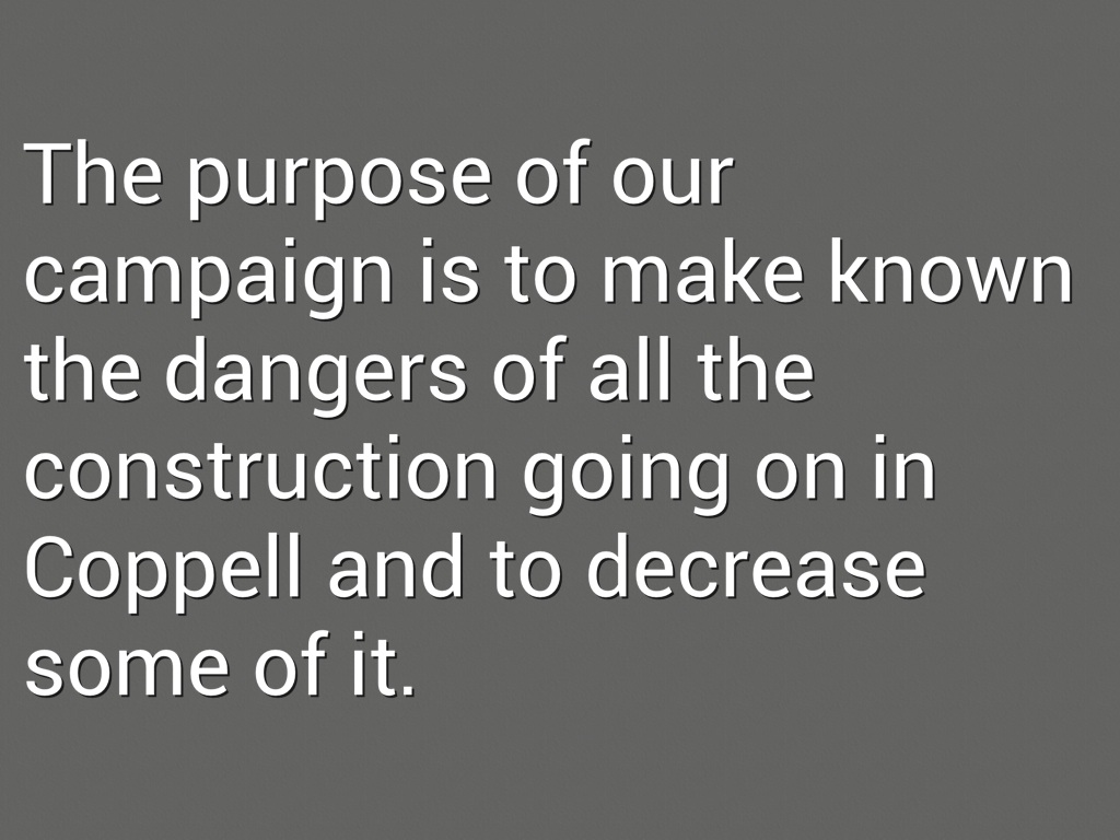 The purpose of our campaign is to make known the dangers of all the construction going on in Coppell and to decrease some of it.