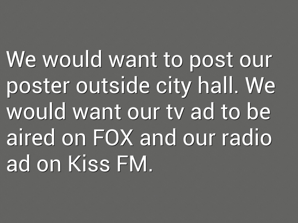 We would want to post our poster outside city hall. We would want our tv ad to be aired on FOX and our radio ad on Kiss FM.