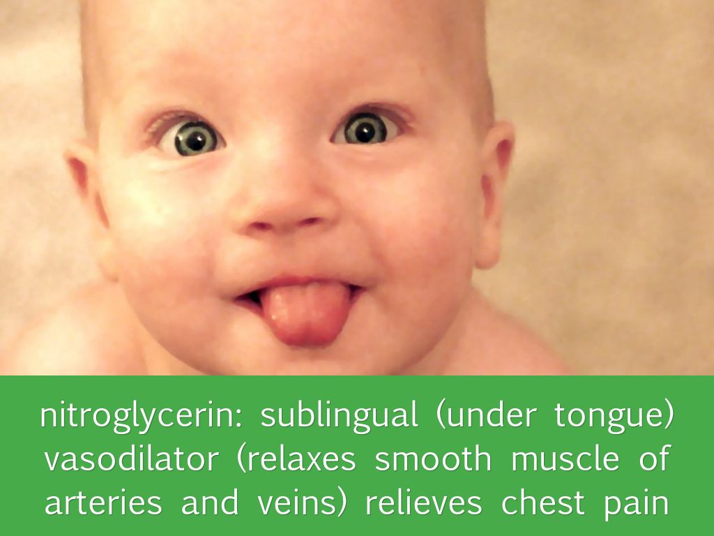 nitroglycerin: sublingual (under tongue) vasodilator (relaxes smooth muscle of arteries and veins) relieves chest pain