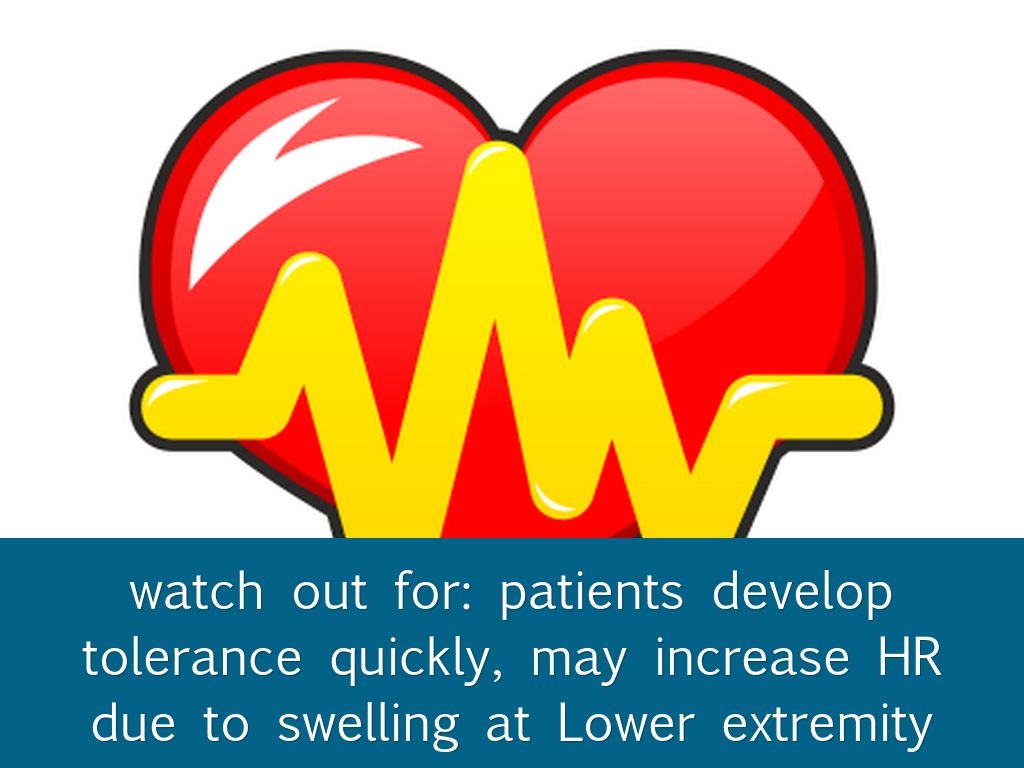 watch out for: patients develop tolerance quickly, may increase HR due to swelling at Lower extremity