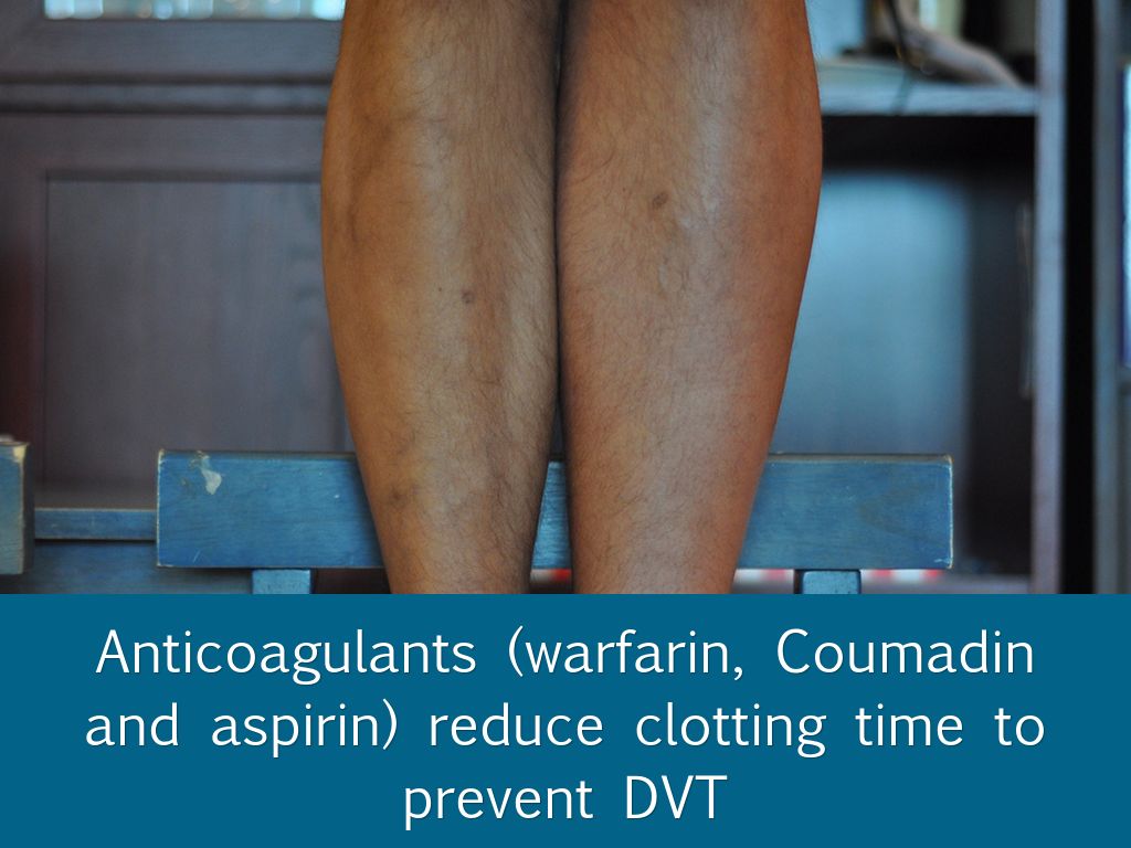 Anticoagulants (warfarin, Coumadin and aspirin) reduce clotting time to prevent DVT