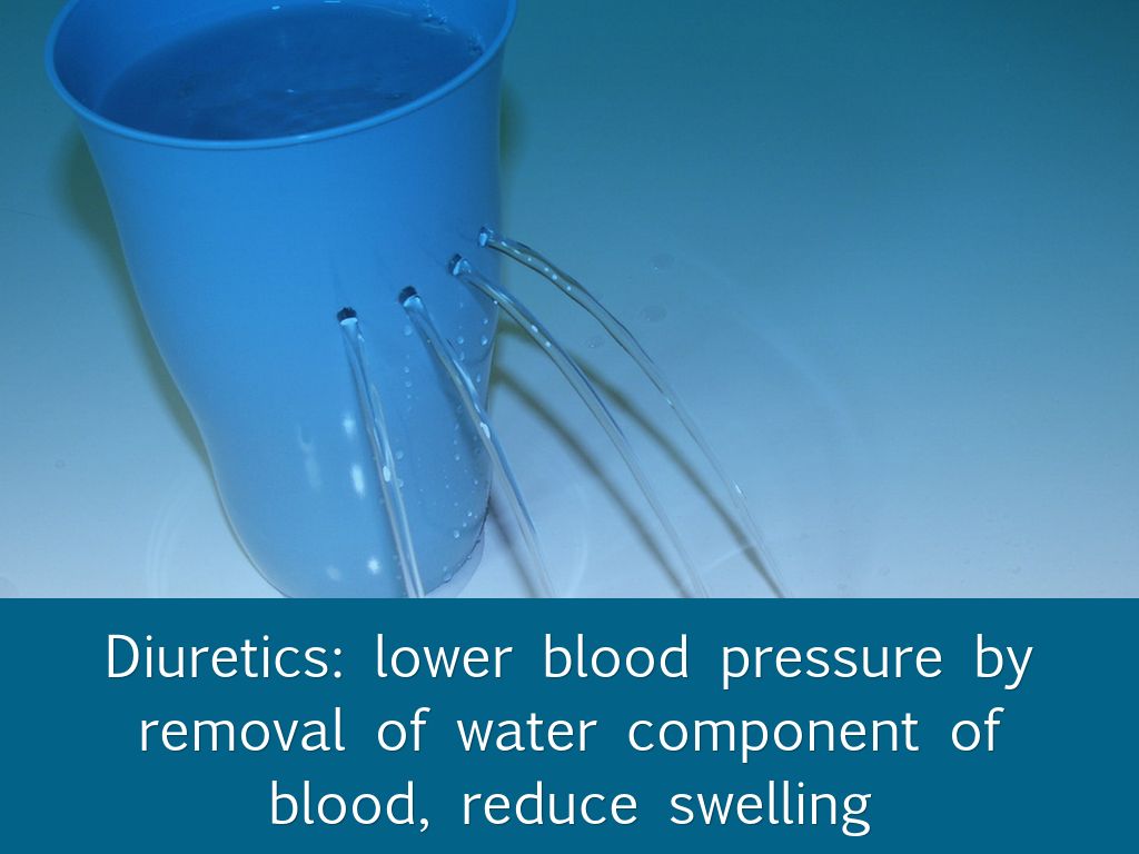 Diuretics: lower blood pressure by removal of water component of blood, reduce swelling