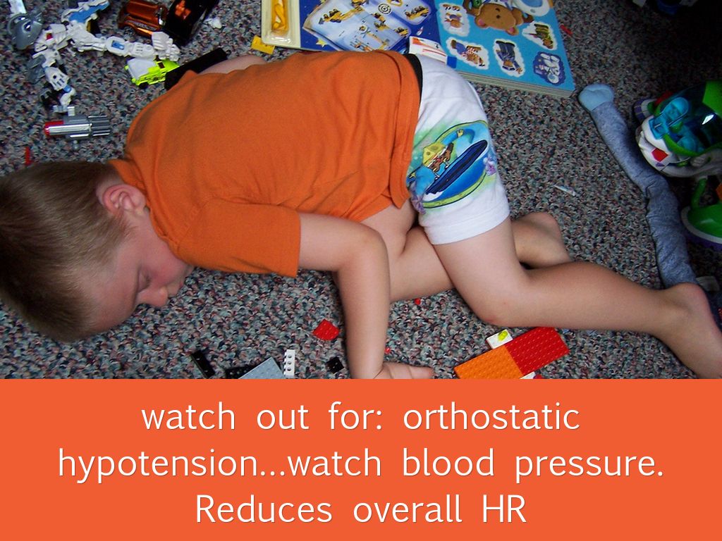 watch out for: orthostatic hypotension…watch blood pressure. Reduces overall HR