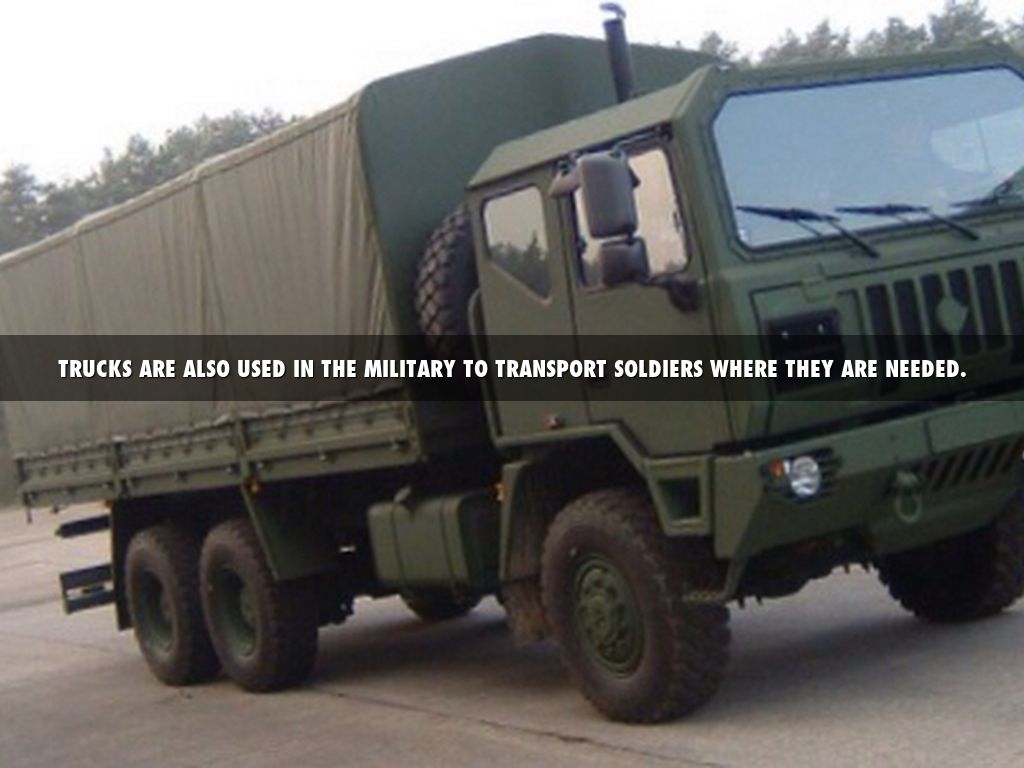 TRUCKS ARE ALSO USED IN THE MILITARY TO TRANSPORT SOLDIERS WHERE THEY ARE NEEDED.