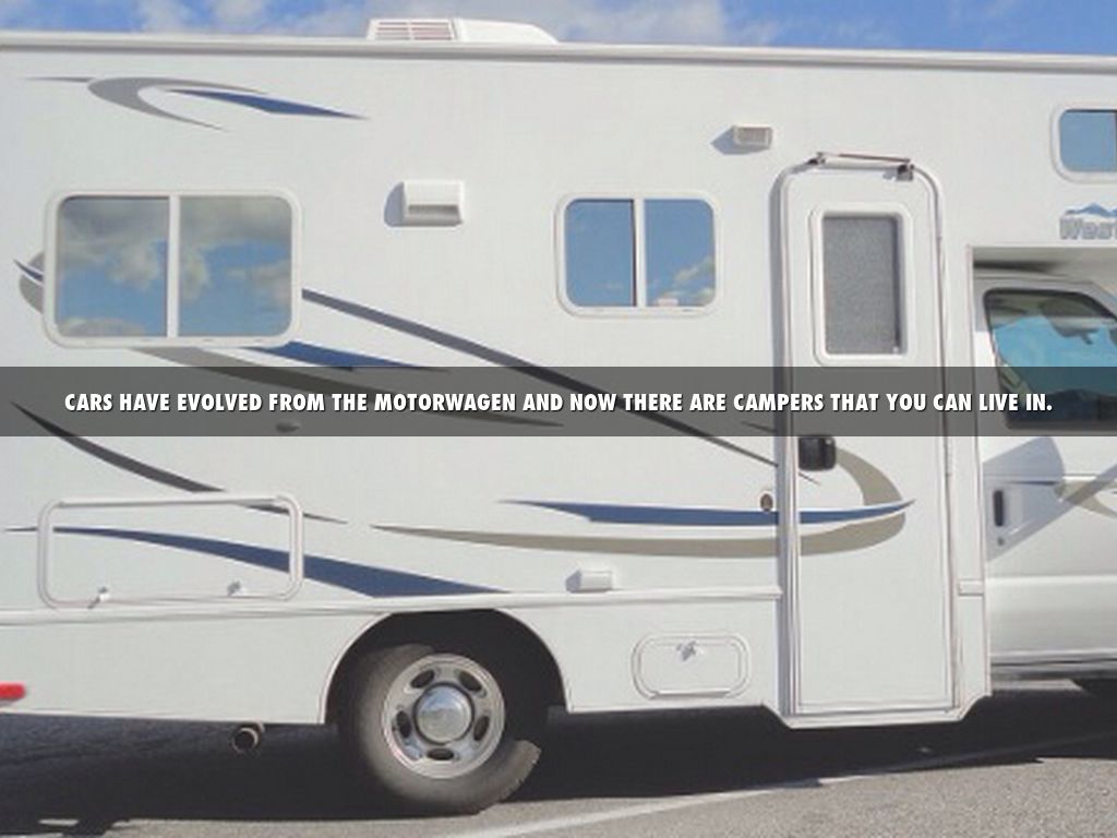 CARS HAVE EVOLVED FROM THE MOTORWAGEN AND NOW THERE ARE CAMPERS THAT YOU CAN LIVE IN.