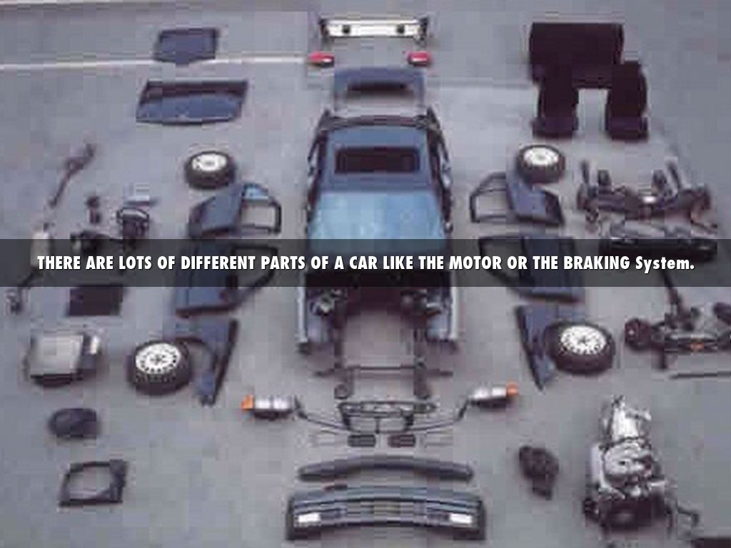 THERE ARE LOTS OF DIFFERENT PARTS OF A CAR LIKE THE MOTOR OR THE BRAKING System.