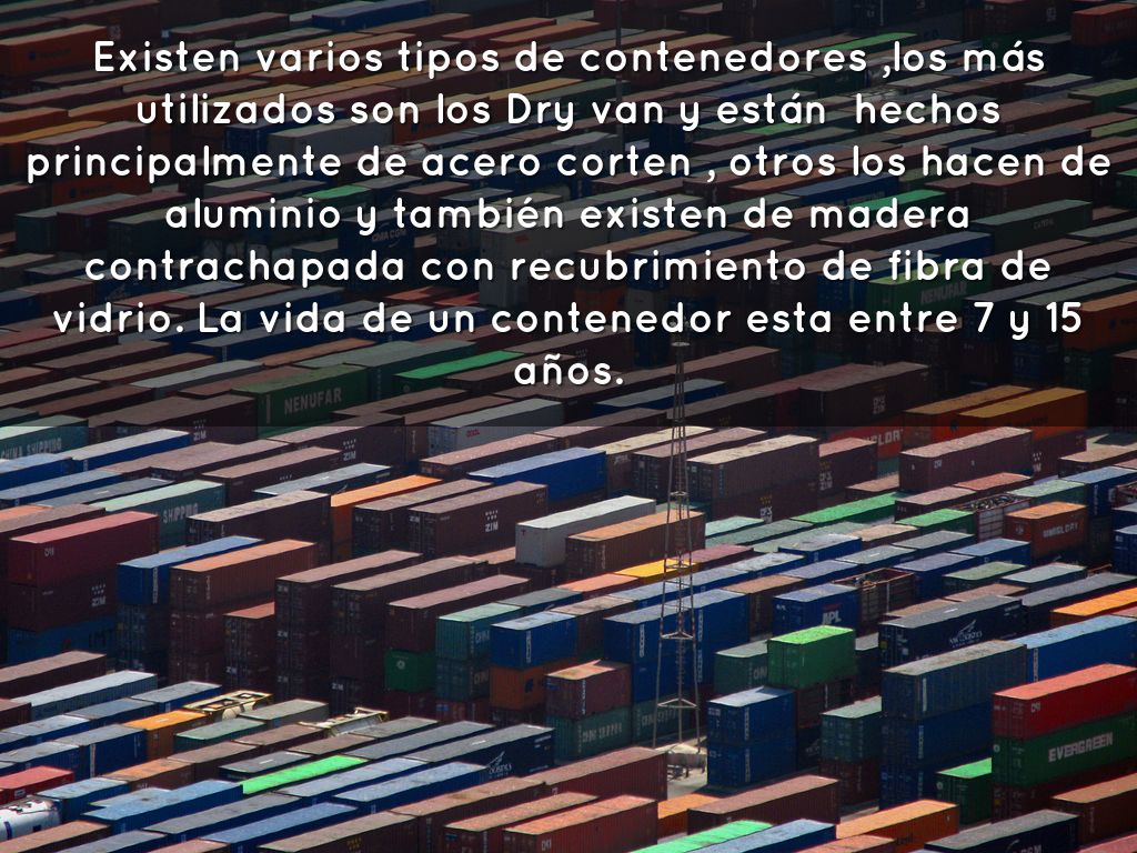 Existen varios tipos de contenedores ,los más utilizados son los Dry van y están hechos principalmente de acero corten , otros los hacen de aluminio y también existen de madera contrachapada con recubrimiento de fibra de vidrio. La vida de un contenedor esta entre 7 y 15 años.