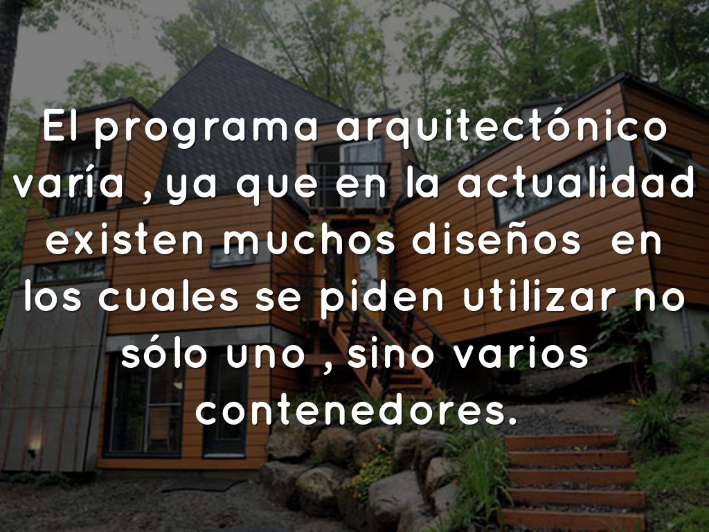 El programa arquitectónico varía , ya que en la actualidad existen muchos diseños en los cuales se piden utilizar no sólo uno , sino varios contenedores.