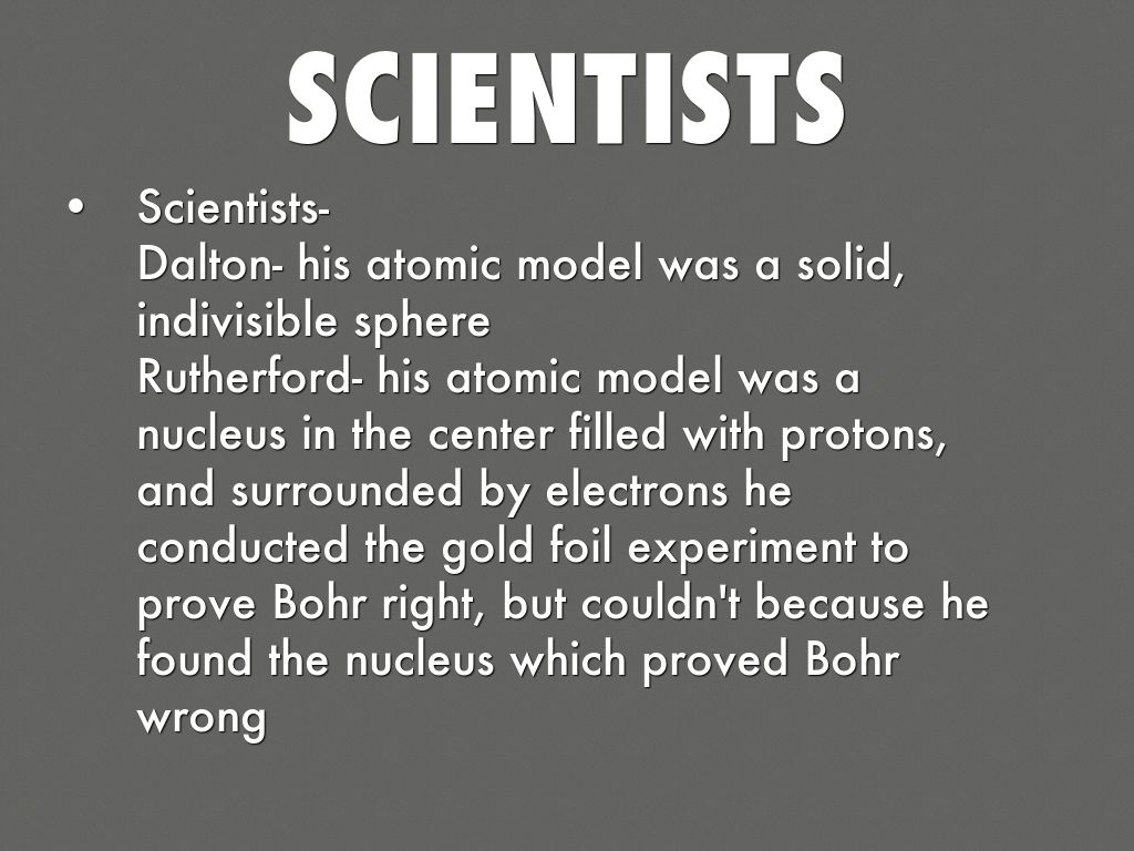 Rutherford- his atomic model was a nucleus in the center filled with protons, and surrounded by electrons he conducted the gold foil experiment to prove Bohr right, but couldn't because he found the nucleus which proved Bohr wrong
