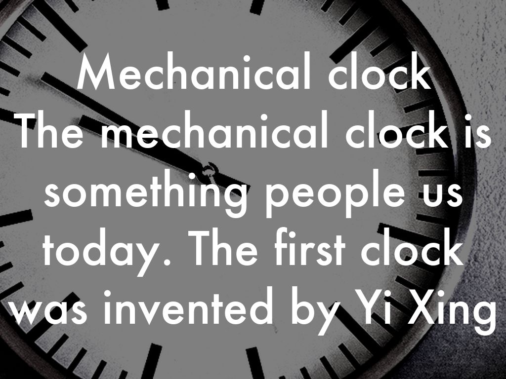 Mechanical clock The mechanical clock is something people us today. The first clock was invented by Yi Xing. It was made in 723AD. We use it to tell time.