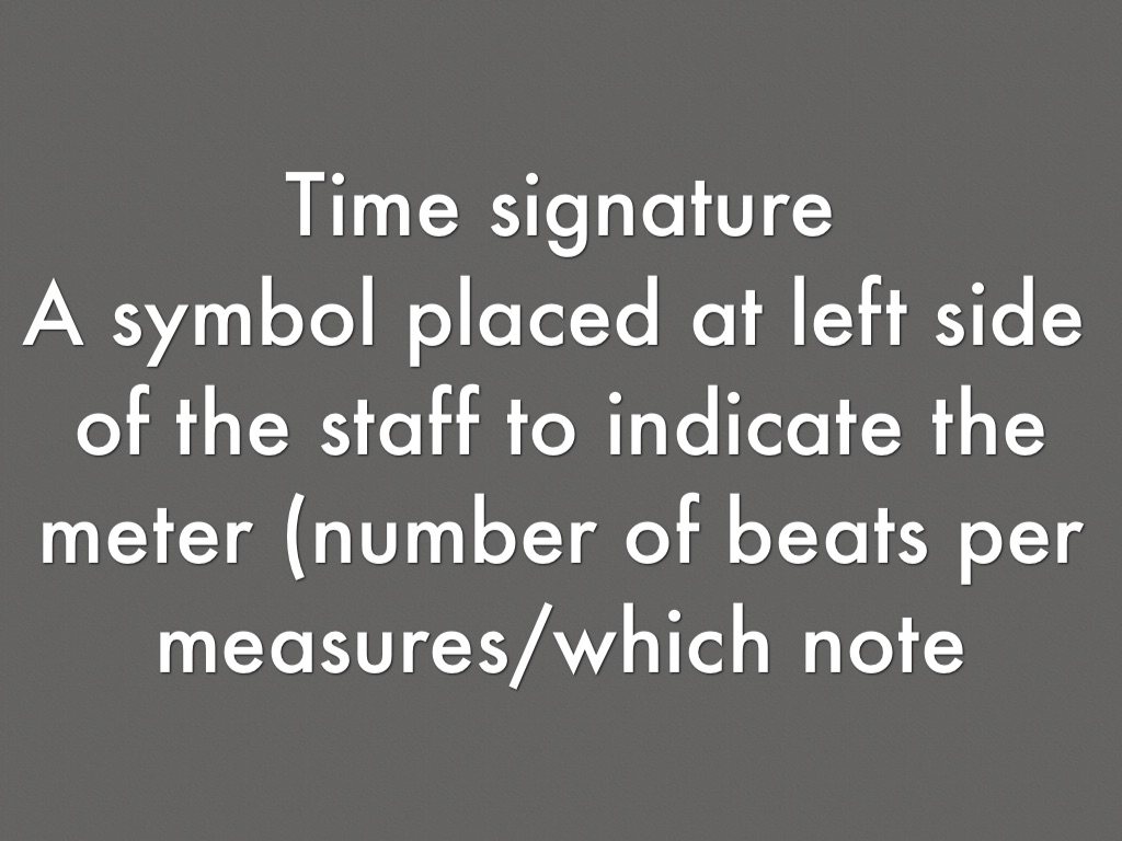 A symbol placed at left side of the staff to indicate the meter (number of beats per measures/which note