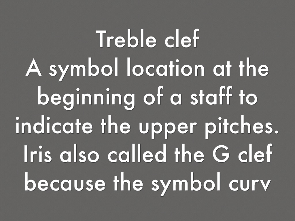 A symbol location at the beginning of a staff to indicate the upper pitches. Iris also called the G clef because the symbol curv