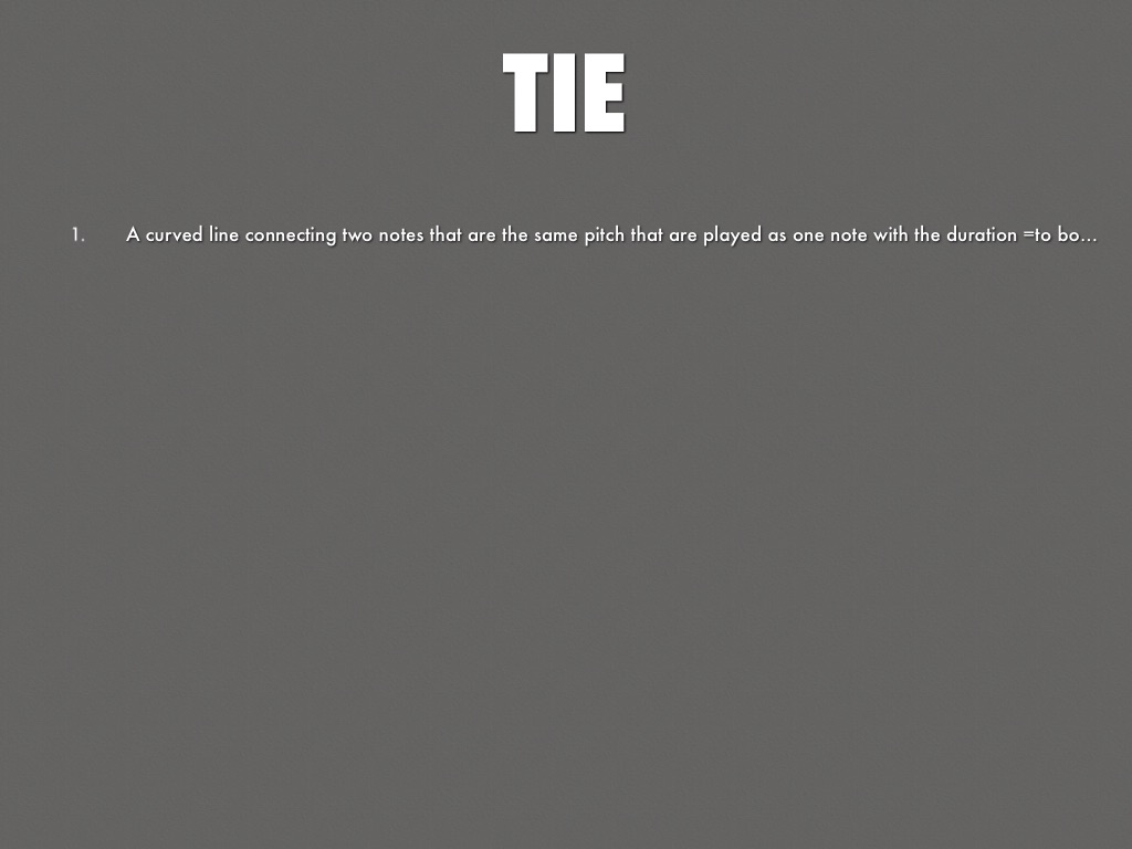 - A curved line connecting two notes that are the same pitch that are played as one note with the duration =to both note's value