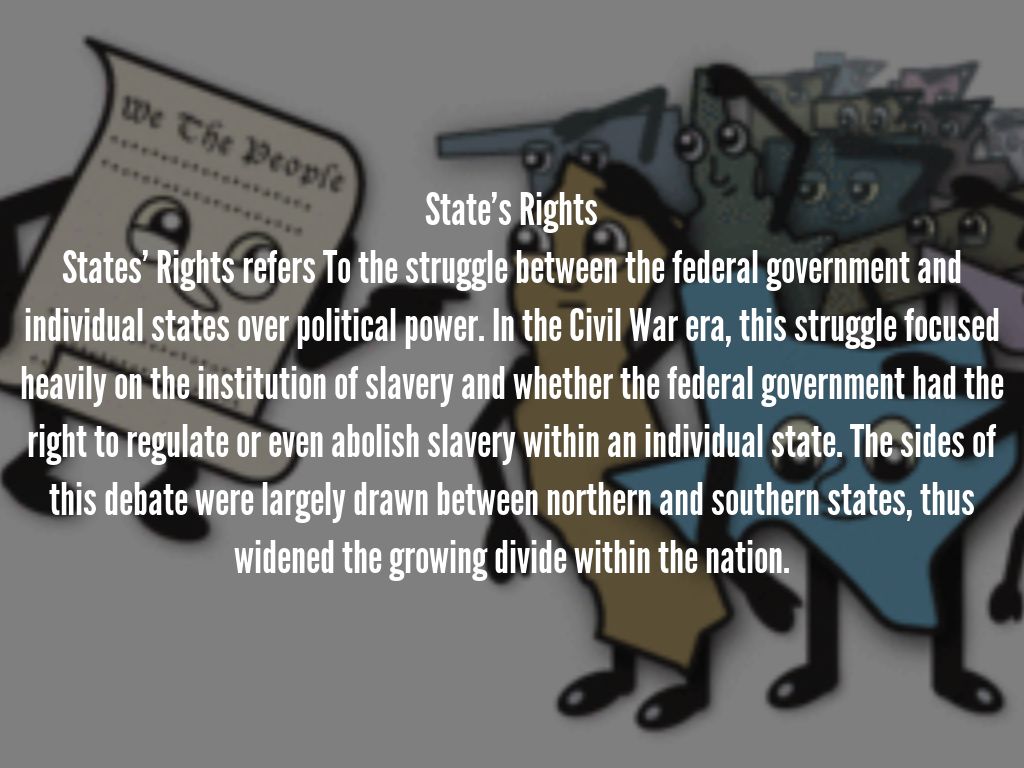 States’ Rights refers To the struggle between the federal government and individual states over political power. In the Civil War era, this struggle focused heavily on the institution of slavery and whether the federal government had the right to regulate or even abolish slavery within an individual state. The sides of this debate were largely drawn between northern and southern states, thus widened the growing divide within the nation.