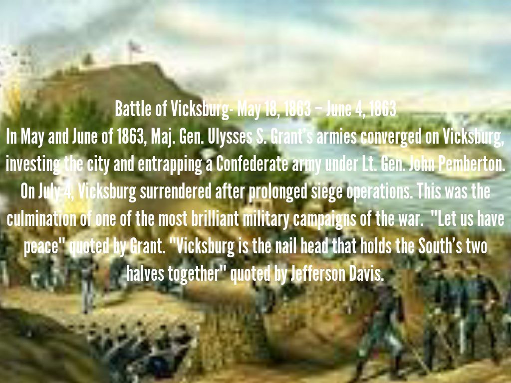 In May and June of 1863, Maj. Gen. Ulysses S. Grant's armies converged on Vicksburg, investing the city and entrapping a Confederate army under Lt. Gen. John Pemberton. On July 4, Vicksburg surrendered after prolonged siege operations. This was the culmination of one of the most brilliant military campaigns of the war. ""Let us have peace"" quoted by Grant. ""Vicksburg is the nail head that holds the South's two halves together"" quoted by Jefferson Davis.
