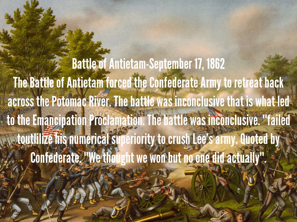 The Battle of Antietam forced the Confederate Army to retreat back across the Potomac River. The battle was inconclusive that is what led to the Emancipation Proclamation. The battle was inconclusive. ""failed toutlilize his numerical superiority to crush Lee’s army. Quoted by Confederate. ""We thought we won but no one did actually"".