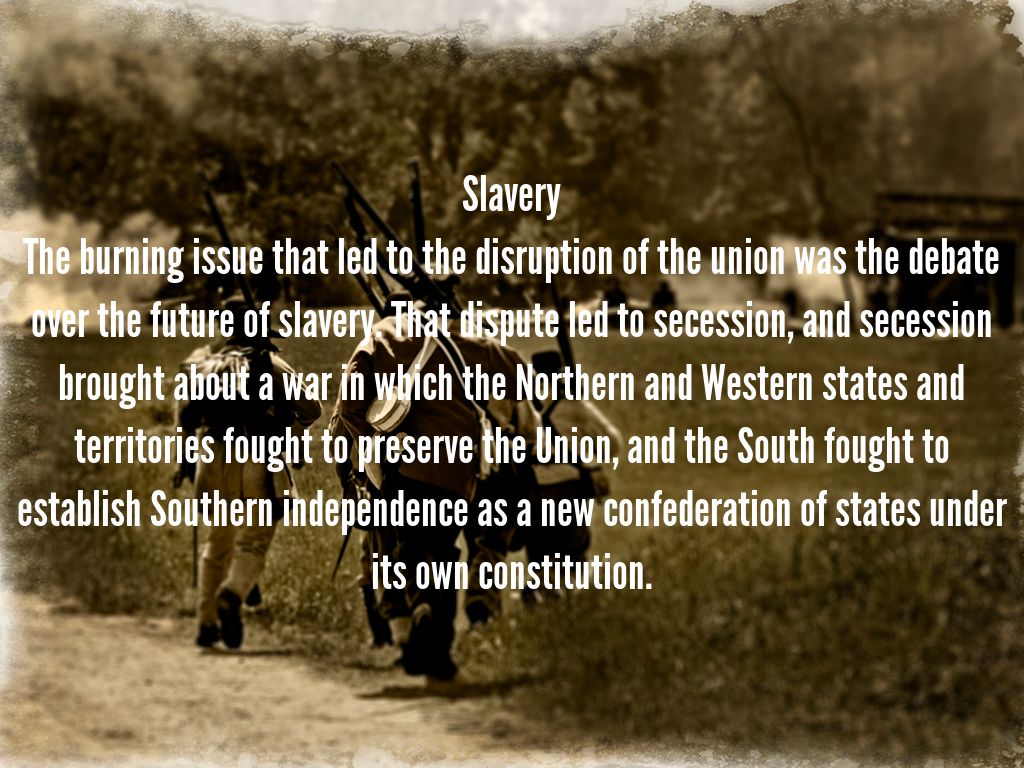 The burning issue that led to the disruption of the union was the debate over the future of slavery. That dispute led to secession, and secession brought about a war in which the Northern and Western states and territories fought to preserve the Union, and the South fought to establish Southern independence as a new confederation of states under its own constitution.