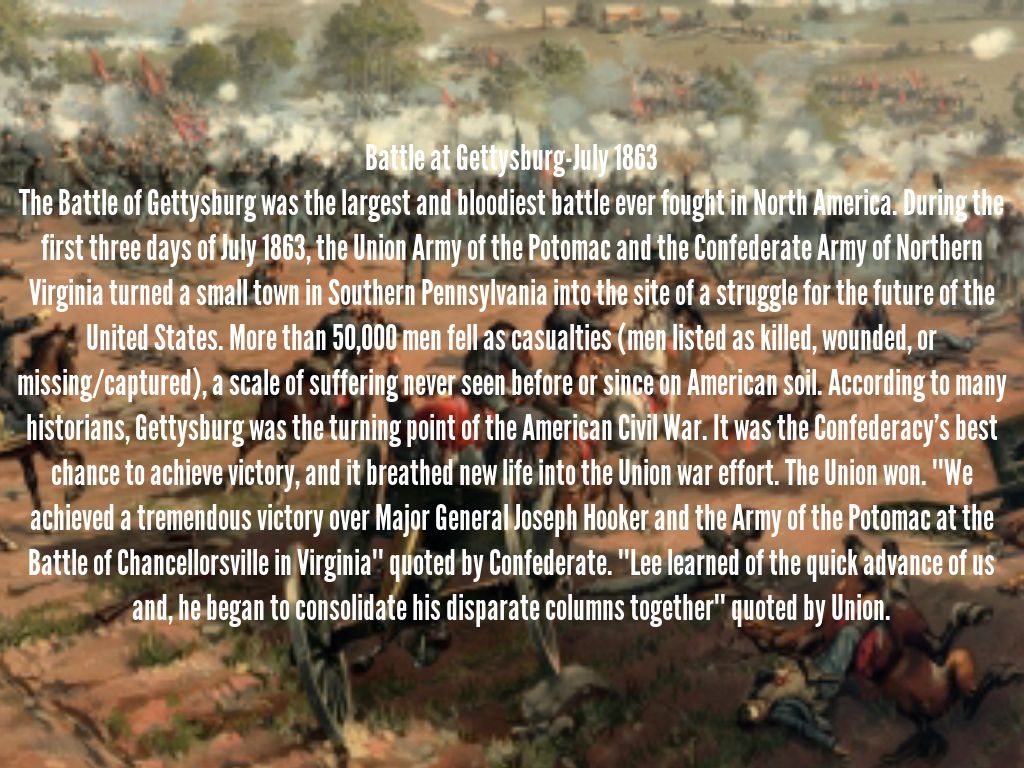 The Battle of Gettysburg was the largest and bloodiest battle ever fought in North America. During the first three days of July 1863, the Union Army of the Potomac and the Confederate Army of Northern Virginia turned a small town in Southern Pennsylvania into the site of a struggle for the future of the United States. More than 50,000 men fell as casualties (men listed as killed, wounded, or missing/captured), a scale of suffering never seen before or since on American soil. According to many historians, Gettysburg was the turning point of the American Civil War. It was the Confederacy's best chance to achieve victory, and it breathed new life into the Union war effort. The Union won. ""We achieved a tremendous victory over Major General Joseph Hooker and the Army of the Potomac at the Battle of Chancellorsville in Virginia"" quoted by Confederate. ""Lee learned of the quick advance of us and, he began to consolidate his disparate columns together"" quoted by Union.