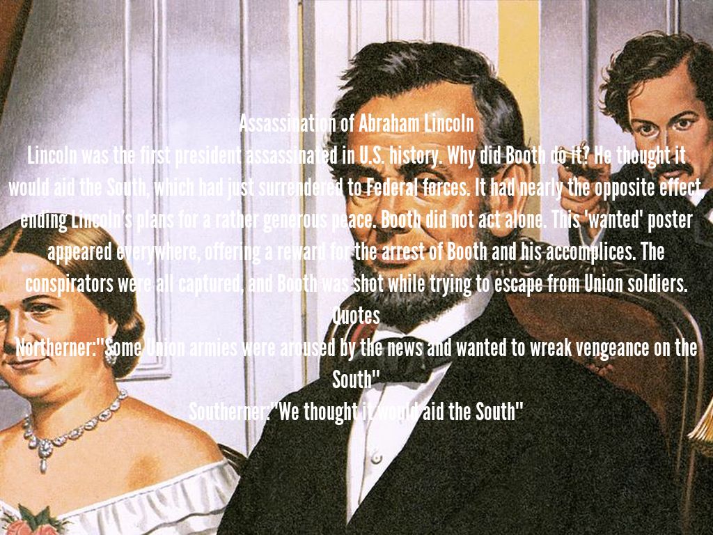 Lincoln was the first president assassinated in U.S. history. Why did Booth do it? He thought it would aid the South, which had just surrendered to Federal forces. It had nearly the opposite effect, ending Lincoln's plans for a rather generous peace. Booth did not act alone. This "wanted" poster appeared everywhere, offering a reward for the arrest of Booth and his accomplices. The conspirators were all captured, and Booth was shot while trying to escape from Union soldiers.