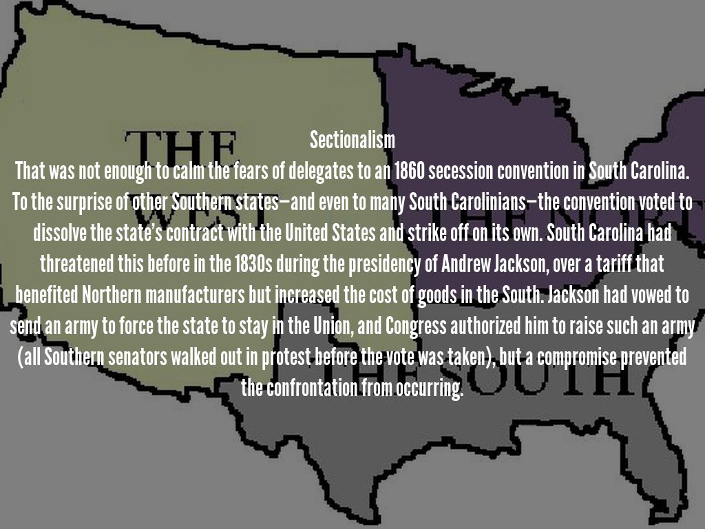 That was not enough to calm the fears of delegates to an 1860 secession convention in South Carolina. To the surprise of other Southern states—and even to many South Carolinians—the convention voted to dissolve the state’s contract with the United States and strike off on its own. South Carolina had threatened this before in the 1830s during the presidency of Andrew Jackson, over a tariff that benefited Northern manufacturers but increased the cost of goods in the South. Jackson had vowed to send an army to force the state to stay in the Union, and Congress authorized him to raise such an army (all Southern senators walked out in protest before the vote was taken), but a compromise prevented the confrontation from occurring.