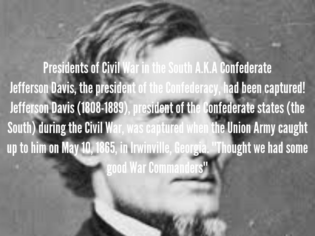 Jefferson Davis, the president of the Confederacy, had been captured! Jefferson Davis (1808-1889), president of the Confederate states (the South) during the Civil War, was captured when the Union Army caught up to him on May 10, 1865, in Irwinville, Georgia. ""Thought we had some good War Commanders""