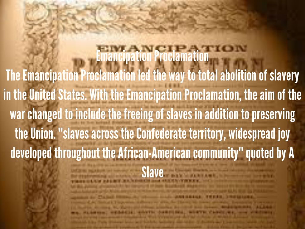 The Emancipation Proclamation led the way to total abolition of slavery in the United States. With the Emancipation Proclamation, the aim of the war changed to include the freeing of slaves in addition to preserving the Union. ""slaves across the Confederate territory, widespread joy developed throughout the African-American community"" quoted by A Slave