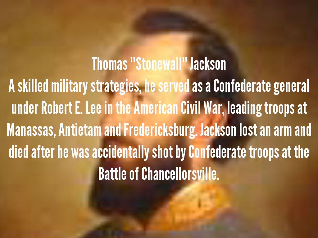 A skilled military strategies, he served as a Confederate general under Robert E. Lee in the American Civil War, leading troops at Manassas, Antietam and Fredericksburg. Jackson lost an arm and died after he was accidentally shot by Confederate troops at the Battle of Chancellorsville.