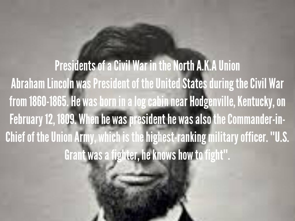 Abraham Lincoln was President of the United States during the Civil War from 1860-1865. He was born in a log cabin near Hodgenville, Kentucky, on February 12, 1809. When he was president he was also the Commander-in-Chief of the Union Army, which is the highest-ranking military officer. ""U.S. Grant was a fighter, he knows how to fight"".