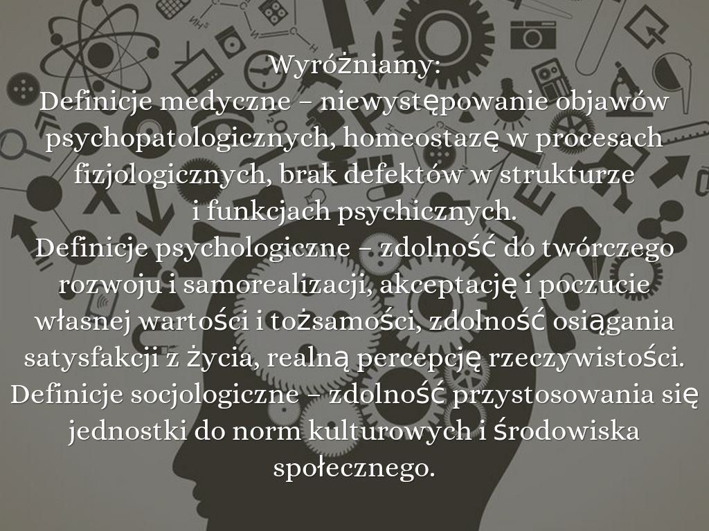 Definicje medyczne – niewystępowanie objawów psychopatologicznych, homeostazę w procesach fizjologicznych, brak defektów w strukturze