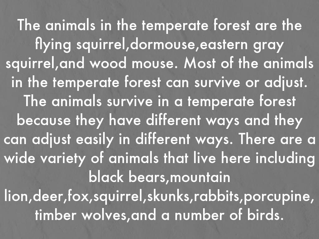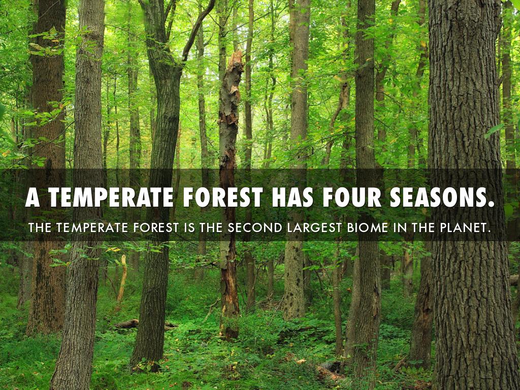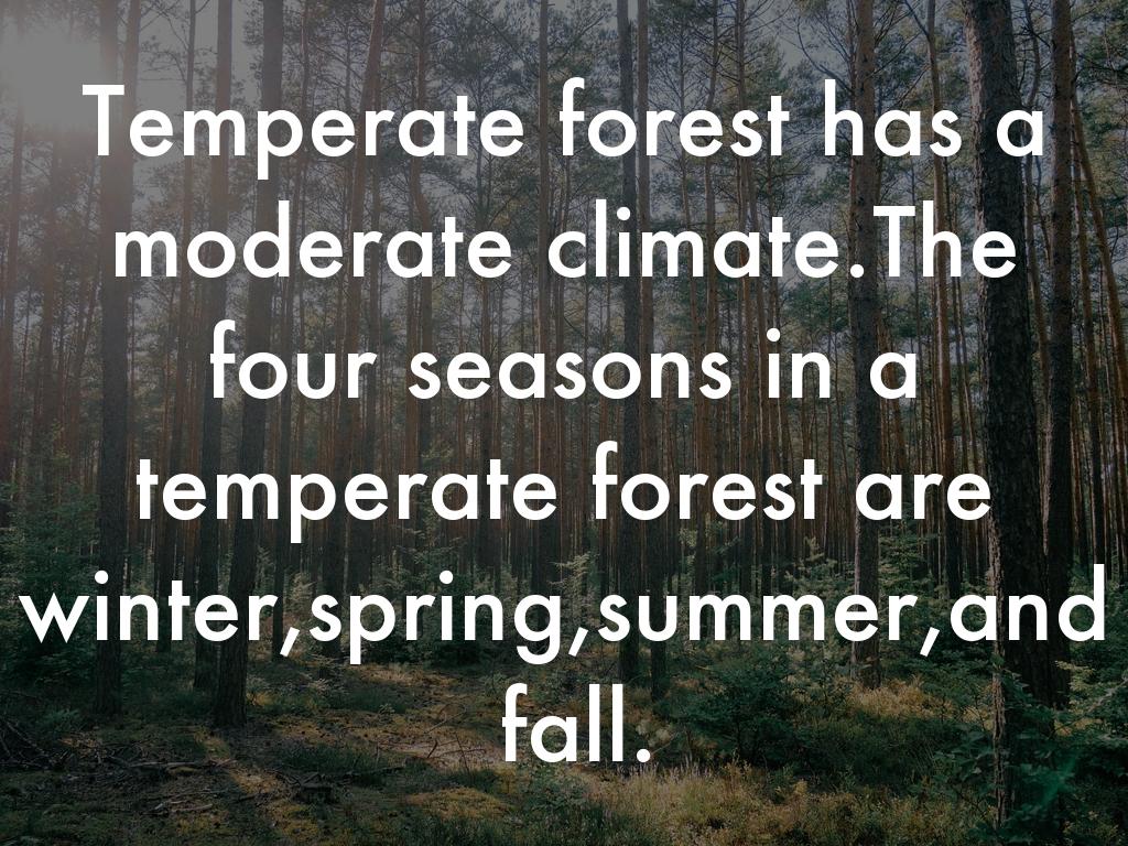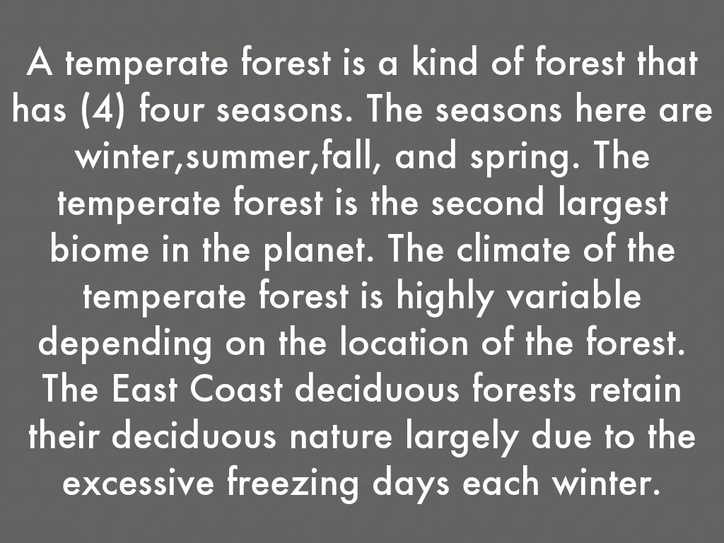A temperate forest is a kind of forest that has (4) four seasons. The seasons here are winter,summer,fall, and spring. The temperate forest is the second largest biome in the planet. The climate of the temperate forest is highly variable depending on the location of the forest. The East Coast deciduous forests retain their deciduous nature largely due to the excessive freezing days each winter.