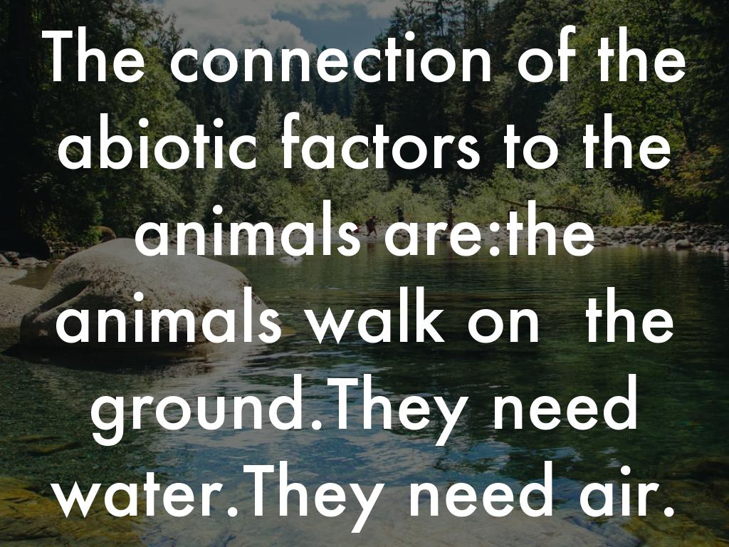 The connection of the abiotic factors to the animals are:the animals walk on the ground.They need water.They need air.
