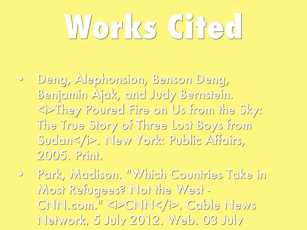 • Park, Madison. "Which Countries Take in Most Refugees? Not the West - CNN.com." CNN. Cable News Network, 5 July 2012. Web. 03 July 2015.