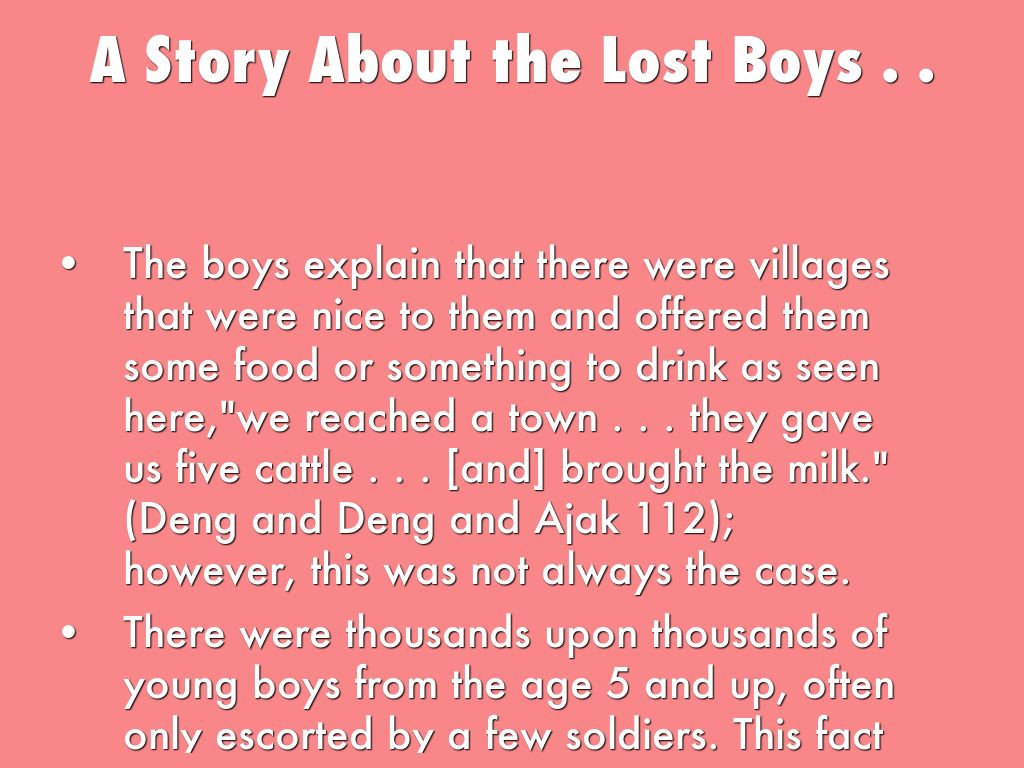 • There were thousands upon thousands of young boys from the age 5 and up, often only escorted by a few soldiers. This fact is also stated in the novel by Alepho who states, "there seemed to be over a thousand of us, maybe two thousand, escorted by just five soldiers." (Deng and Deng and Ajak 127).