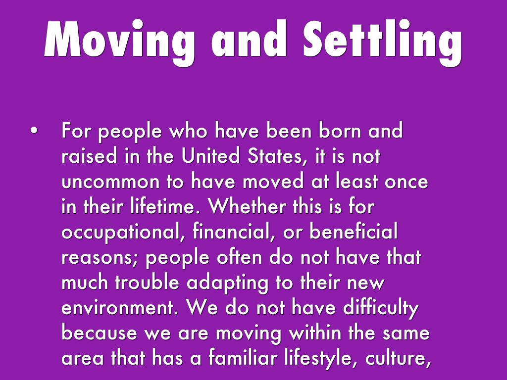 • For people who have been born and raised in the United States, it is not uncommon to have moved at least once in their lifetime. Whether this is for occupational, financial, or beneficial reasons; people often do not have that much trouble adapting to their new environment. We do not have difficulty because we are moving within the same area that has a familiar lifestyle, culture, and language.