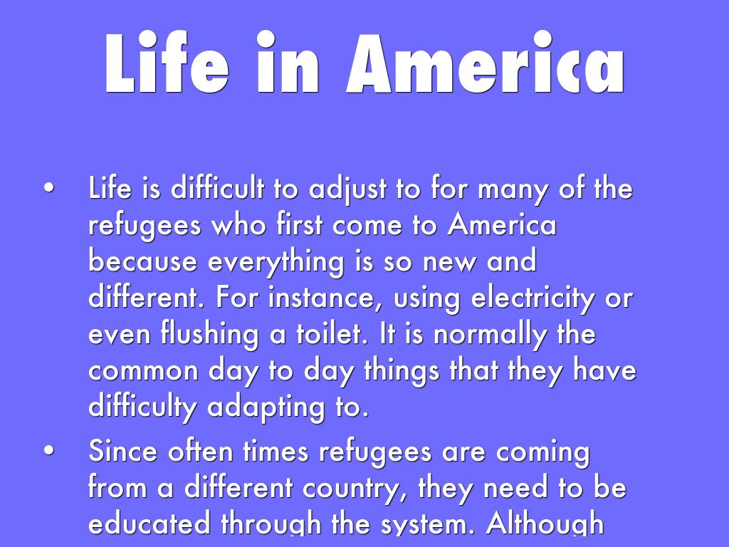 • Life is difficult to adjust to for many of the refugees who first come to America because everything is so new and different. For instance, using electricity or even flushing a toilet. It is normally the common day to day things that they have difficulty adapting to.