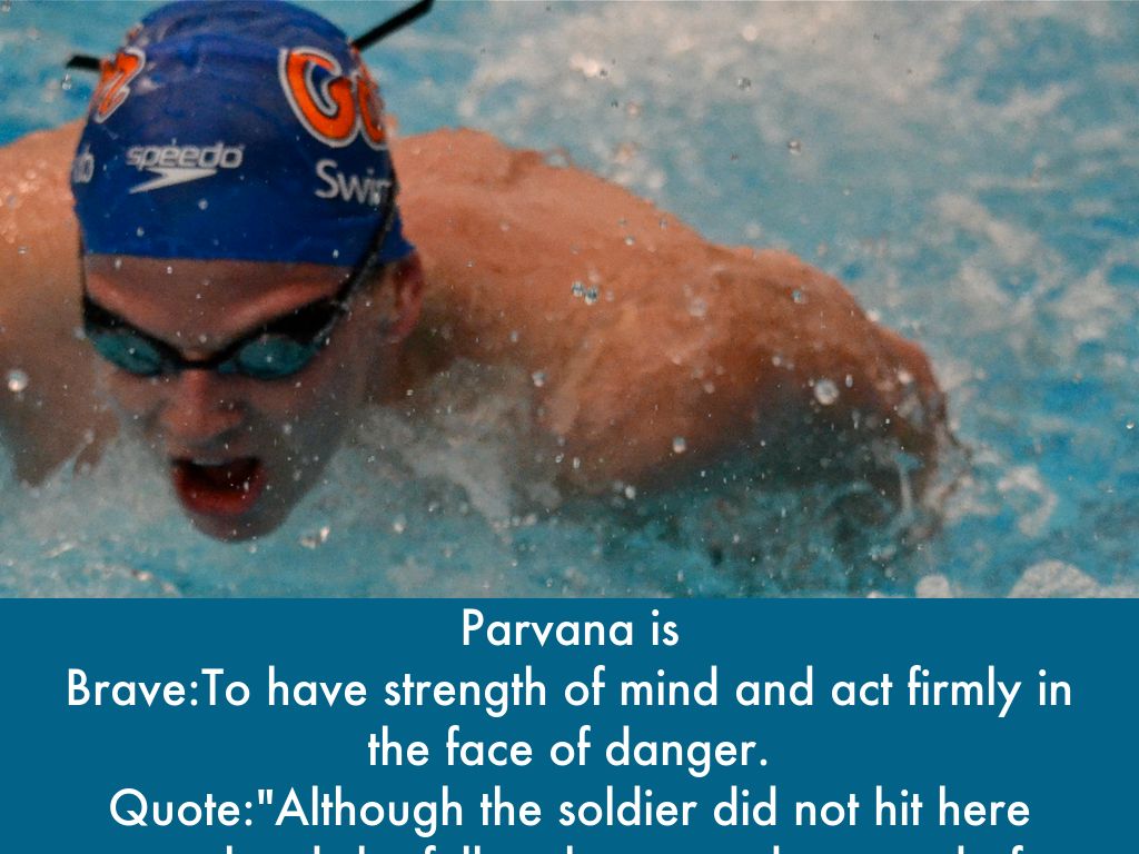 Parvana is Brave:To have strength of mind and act firmly in the face of danger. Quote:"Although the soldier did not hit here very hard she fell to the ground covered of pieces of fathers photograph in a flash she tucked the pieces out of sight under her chador.pg.42