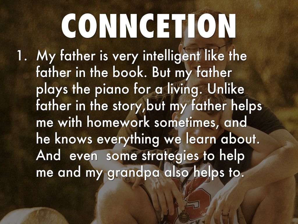 My father is very intelligent like the father in the book. But my father plays the piano for a living. Unlike father in the story,but my father helps me with homework sometimes, and he knows everything we learn about. And even some strategies to help me and my grandpa also helps to.