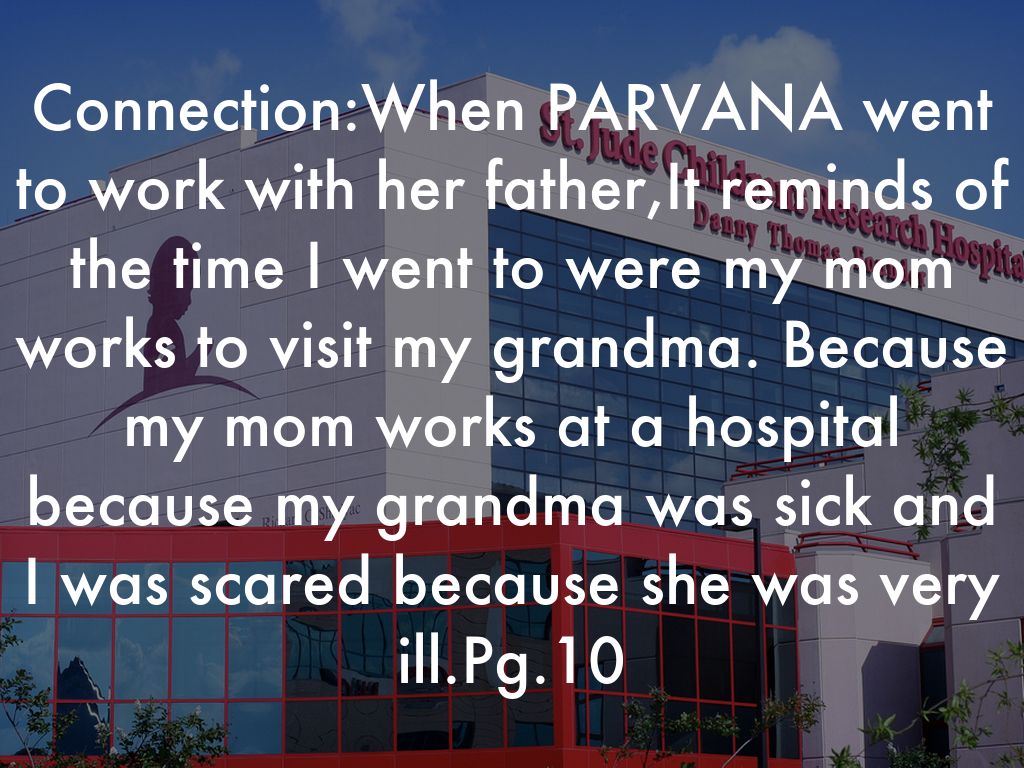 Connection:When PARVANA went to work with her father,It reminds of the time I went to were my mom works to visit my grandma. Because my mom works at a hospital because my grandma was sick and I was scared because she was very ill.Pg.10