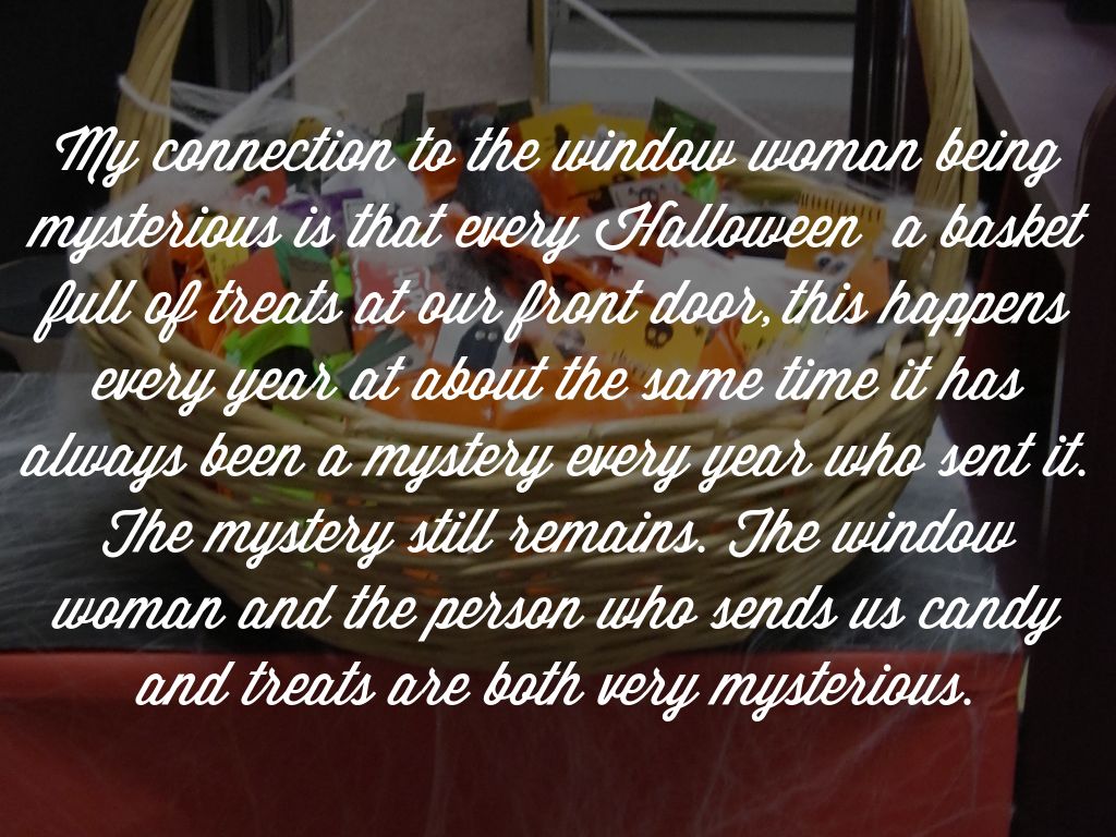 My connection to the window woman being mysterious is that every Halloween a basket full of treats at our front door, this happens every year at about the same time it has always been a mystery every year who sent it. The mystery still remains. The window woman and the person who sends us candy and treats are both very mysterious.