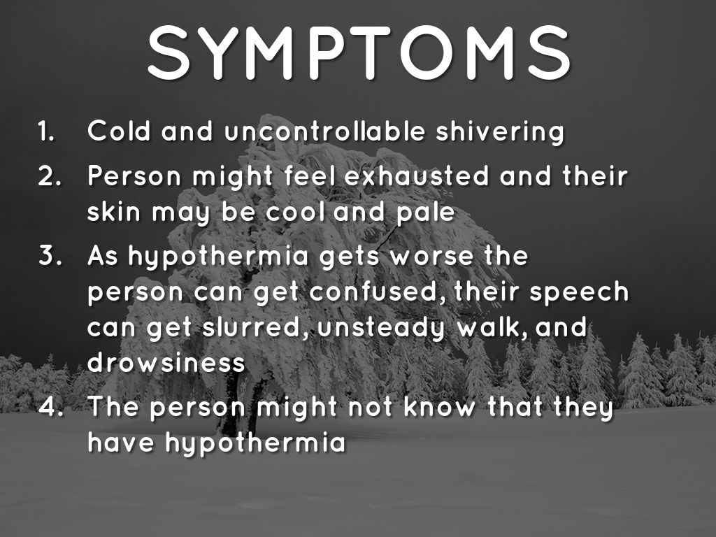 As hypothermia gets worse the person can get confused, they can have slurred speech, unsteady walk, and drowsiness.