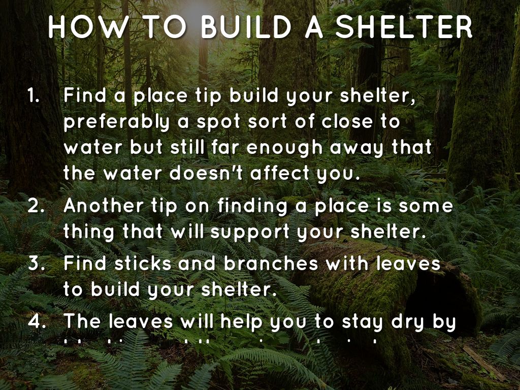 Find a place to build your shelter, preferably a spot sort of close to water but still far enough away that the water doesn't affect you.