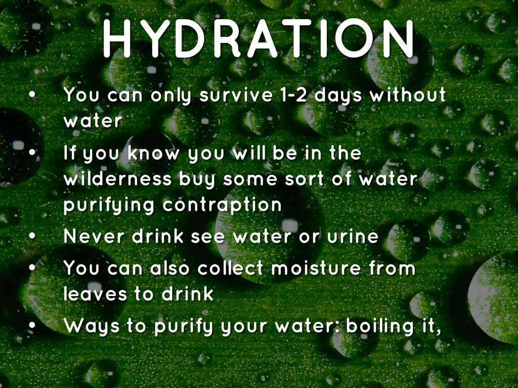 Ways to purify your water: boiling it, filtering it, you can use tincture of iodine to clean it up, you can use UV lights, and solar power