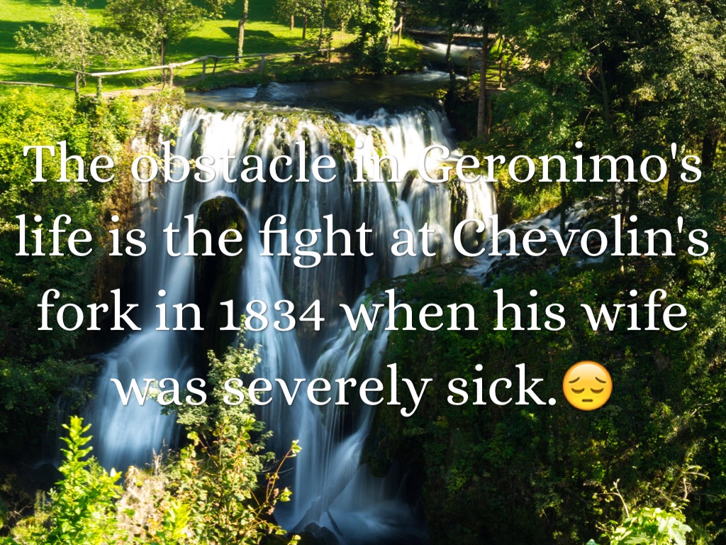 The obstacle in Geronimo's life is the fight at Chevolin's fork in 1834 when his wife was severely sick.😔