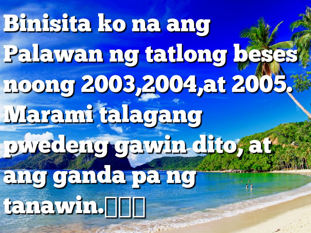Binisita ko na ang Palawan ng tatlong beses noong 2003,2004,at 2005. Marami talagang pwedeng gawin dito, at ang ganda pa ng tanawin.😮😀👌
